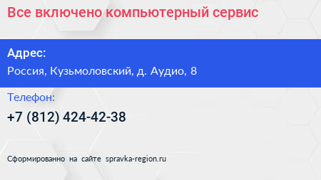 Все включено, компьютерный сервис по адресу 72, Верхняя улица, СНТ «Аудио», Кузьмоловское городское поселение, Всеволожский район, Ленинградская область, Северо-Западный федеральный округ, 188664, Россия в дальнейшем Организация, размещена в следующих категориях: