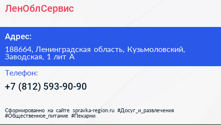 ЛенОблСервис по адресу 188664, Ленинградская область, Кузьмоловский, Заводская, 1 лит А в дальнейшем Организация, размещена в следующих категориях:
