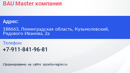 BAU-Master, компания по адресу 188663, Ленинградская область, Кузьмоловский, Рядового Иванова, 2а в дальнейшем Организация, размещена в следующих категориях: