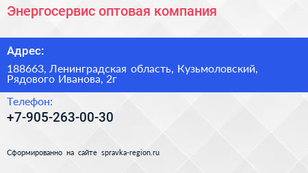 Энергосервис, оптовая компания по адресу 188663, Ленинградская область, Кузьмоловский, Рядового Иванова, 2г в дальнейшем Организация, размещена в следующих категориях: