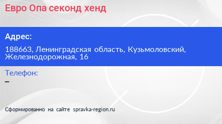 Евро`Опа, секонд-хенд по адресу 188663, Ленинградская область, Кузьмоловский, Железнодорожная, 16 в дальнейшем Организация, размещена в следующих категориях: