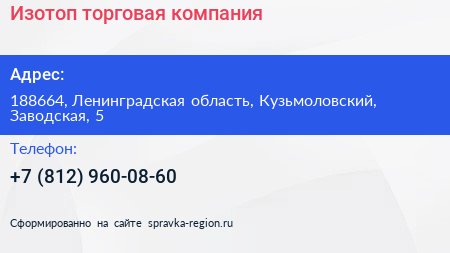 Изотоп, торговая компания по адресу 188664, Ленинградская область, Кузьмоловский, Заводская, 5 в дальнейшем Организация, размещена в следующих категориях: