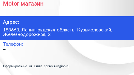 Motor, магазин по адресу 188663, Ленинградская область, Кузьмоловский, Железнодорожная, 2 в дальнейшем Организация, размещена в следующих категориях: