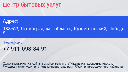 Центр бытовых услуг по адресу 188663, Ленинградская область, Кузьмоловский, Победы, 8 в дальнейшем Организация, размещена в следующих категориях: