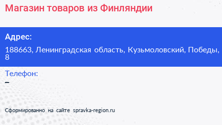 Магазин товаров из Финляндии по адресу 188663, Ленинградская область, Кузьмоловский, Победы, 8 в дальнейшем Организация, размещена в следующих категориях: