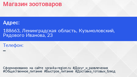 Магазин зоотоваров по адресу 188663, Ленинградская область, Кузьмоловский, Рядового Иванова, 23 в дальнейшем Организация, размещена в следующих категориях: