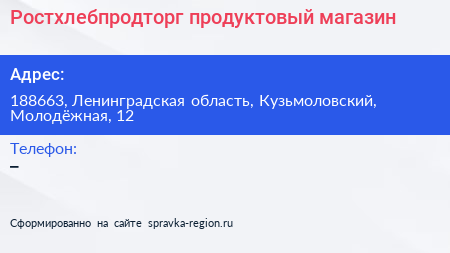 Ростхлебпродторг, продуктовый магазин по адресу 188663, Ленинградская область, Кузьмоловский, Молодёжная, 12 в дальнейшем Организация, размещена в следующих категориях: