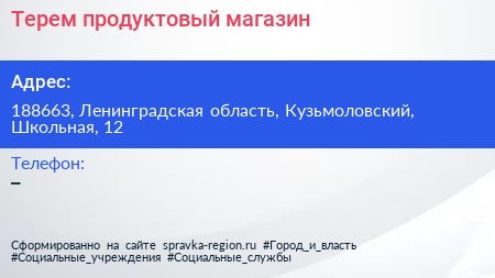 Терем, продуктовый магазин по адресу 188663, Ленинградская область, Кузьмоловский, Школьная, 12 в дальнейшем Организация, размещена в следующих категориях: