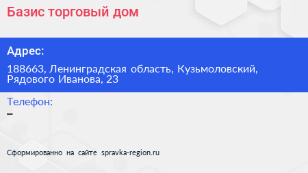 Базис, торговый дом по адресу 188663, Ленинградская область, Кузьмоловский, Рядового Иванова, 23 в дальнейшем Организация, размещена в следующих категориях: