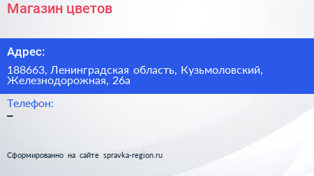 Магазин цветов по адресу 188663, Ленинградская область, Кузьмоловский, Железнодорожная, 26а в дальнейшем Организация, размещена в следующих категориях: