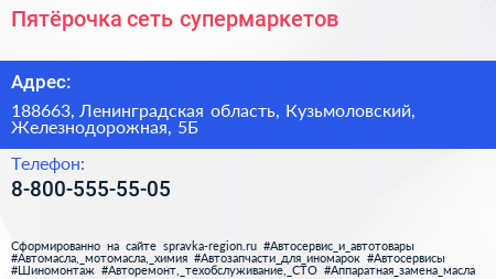Пятёрочка, сеть супермаркетов по адресу 188663, Ленинградская область, Кузьмоловский, Железнодорожная, 5Б в дальнейшем Организация, размещена в следующих категориях: