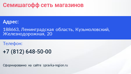 Семишагофф, сеть магазинов по адресу 188663, Ленинградская область, Кузьмоловский, Железнодорожная, 20 в дальнейшем Организация, размещена в следующих категориях: