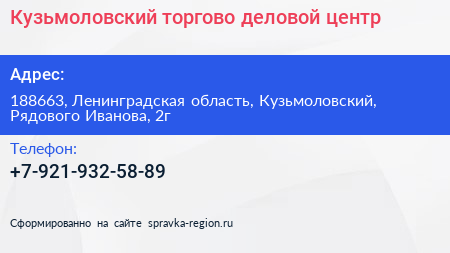 Кузьмоловский, торгово-деловой центр по адресу 188663, Ленинградская область, Кузьмоловский, Рядового Иванова, 2г в дальнейшем Организация, размещена в следующих категориях:
