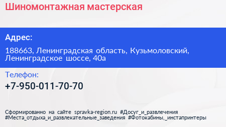 Шиномонтажная мастерская по адресу 188663, Ленинградская область, Кузьмоловский, Ленинградское шоссе, 40а в дальнейшем Организация, размещена в следующих категориях: