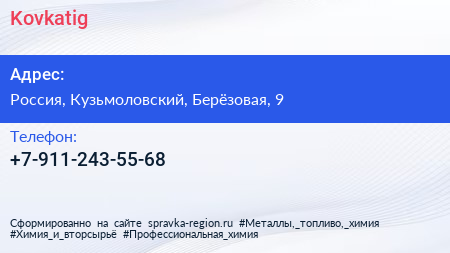 Kovkatig по адресу 9, Берёзовая улица, Куялово, Кузьмоловское городское поселение, Всеволожский район, Ленинградская область, Северо-Западный федеральный округ, 188663, Россия в дальнейшем Организация, размещена в следующих категориях: