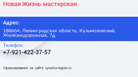 Новая Жизнь, мастерская по адресу 188664, Ленинградская область, Кузьмоловский, Железнодорожная, 7д в дальнейшем Организация, размещена в следующих категориях: