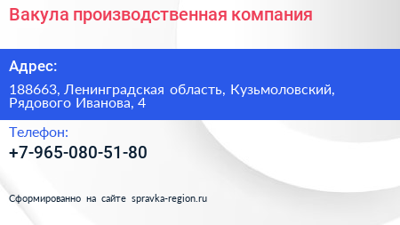 Вакула, производственная компания по адресу 188663, Ленинградская область, Кузьмоловский, Рядового Иванова, 4 в дальнейшем Организация, размещена в следующих категориях: