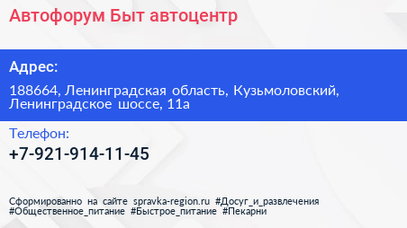 Автофорум-Быт, автоцентр по адресу 188664, Ленинградская область, Кузьмоловский, Ленинградское шоссе, 11а в дальнейшем Организация, размещена в следующих категориях: