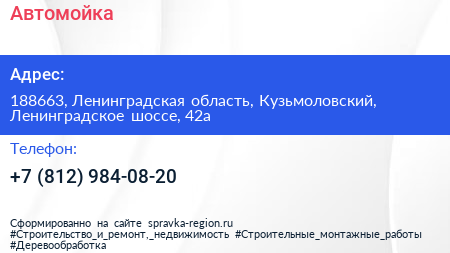 Автомойка по адресу 188663, Ленинградская область, Кузьмоловский, Ленинградское шоссе, 42а в дальнейшем Организация, размещена в следующих категориях: