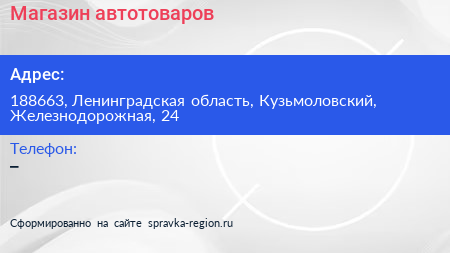 Магазин автотоваров по адресу 188663, Ленинградская область, Кузьмоловский, Железнодорожная, 24 в дальнейшем Организация, размещена в следующих категориях: