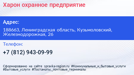 Харон, охранное предприятие по адресу 188663, Ленинградская область, Кузьмоловский, Железнодорожная, 26 в дальнейшем Организация, размещена в следующих категориях: