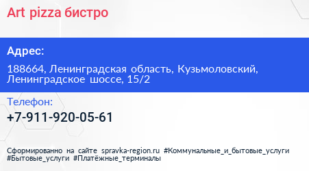 Art pizza, бистро по адресу 188664, Ленинградская область, Кузьмоловский, Ленинградское шоссе, 15/2 в дальнейшем Организация, размещена в следующих категориях: