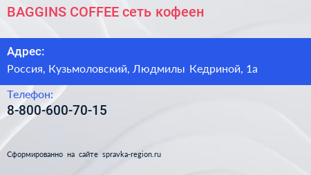 BAGGINS COFFEE, сеть кофеен по адресу Охта-парк, Горный проезд, ЖК «Горная деревня», Мистолово, Бугровское городское поселение, Всеволожский район, Ленинградская область, Северо-Западный федеральный округ, 188660, Россия в дальнейшем Организация, размещена в следующих категориях: