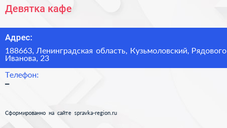 Девятка, кафе по адресу 188663, Ленинградская область, Кузьмоловский, Рядового Иванова, 23 в дальнейшем Организация, размещена в следующих категориях: