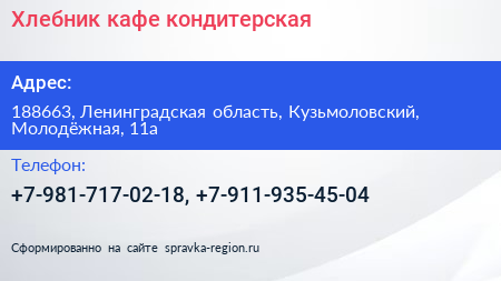 Хлебник, кафе-кондитерская по адресу 188663, Ленинградская область, Кузьмоловский, Молодёжная, 11а в дальнейшем Организация, размещена в следующих категориях: