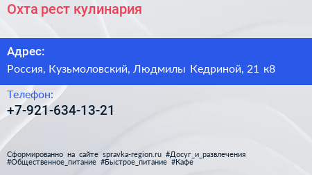Охта рест, кулинария по адресу 21 к6, улица Людмилы Кедриной, Мистолово, Бугровское городское поселение, Всеволожский район, Ленинградская область, Северо-Западный федеральный округ, 188660, Россия в дальнейшем Организация, размещена в следующих категориях: