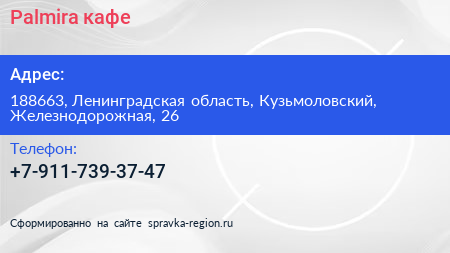 Palmira, кафе по адресу 188663, Ленинградская область, Кузьмоловский, Железнодорожная, 26 в дальнейшем Организация, размещена в следующих категориях: