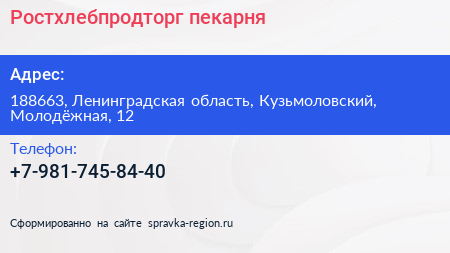 Ростхлебпродторг, пекарня по адресу 188663, Ленинградская область, Кузьмоловский, Молодёжная, 12 в дальнейшем Организация, размещена в следующих категориях: