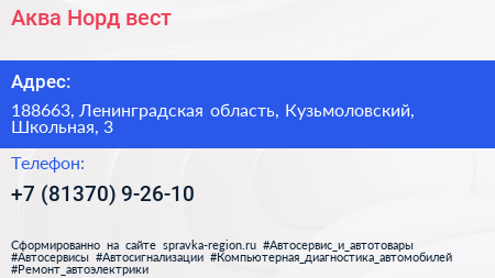Аква Норд-вест по адресу 188663, Ленинградская область, Кузьмоловский, Школьная, 3 в дальнейшем Организация, размещена в следующих категориях: