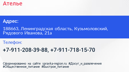 Ателье по адресу 188663, Ленинградская область, Кузьмоловский, Рядового Иванова, 21а в дальнейшем Организация, размещена в следующих категориях:
