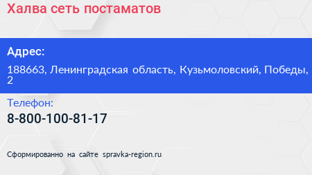 Халва, сеть постаматов по адресу 188663, Ленинградская область, Кузьмоловский, Победы, 2 в дальнейшем Организация, размещена в следующих категориях: