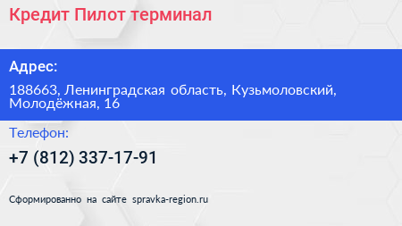 Кредит Пилот, терминал по адресу 188663, Ленинградская область, Кузьмоловский, Молодёжная, 16 в дальнейшем Организация, размещена в следующих категориях: