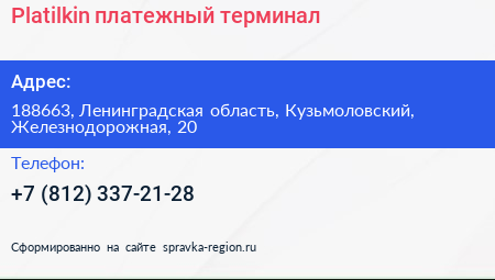 Platilkin, платежный терминал по адресу 188663, Ленинградская область, Кузьмоловский, Железнодорожная, 20 в дальнейшем Организация, размещена в следующих категориях: