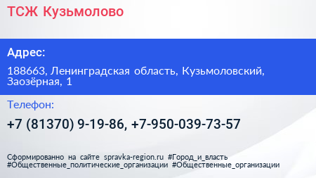 ТСЖ Кузьмолово по адресу 188663, Ленинградская область, Кузьмоловский, Заозёрная, 1 в дальнейшем Организация, размещена в следующих категориях:
