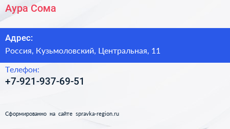 Аура-Сома по адресу 11, Центральная улица, Кузьмолово, Кузьмоловское городское поселение, Всеволожский район, Ленинградская область, Северо-Западный федеральный округ, 188663, Россия в дальнейшем Организация, размещена в следующих категориях:
