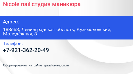 Nicole nail, студия маникюра по адресу 188663, Ленинградская область, Кузьмоловский, Молодёжная, 8 в дальнейшем Организация, размещена в следующих категориях: