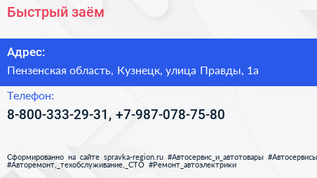 Быстрый заём по адресу Пензенская область, Кузнецк, улица Правды, 1а в дальнейшем Организация, размещена в следующих категориях: