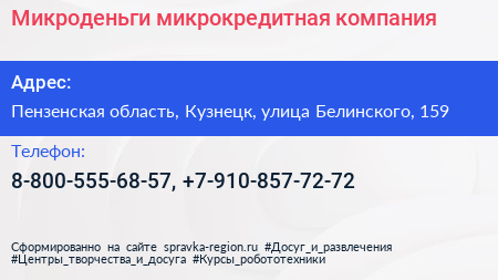 Микроденьги, микрокредитная компания по адресу Пензенская область, Кузнецк, улица Белинского, 159 в дальнейшем Организация, размещена в следующих категориях: