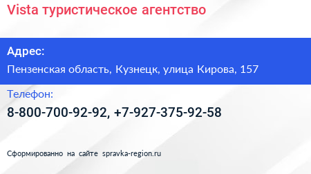 Vista, туристическое агентство по адресу Пензенская область, Кузнецк, улица Кирова, 157 в дальнейшем Организация, размещена в следующих категориях: