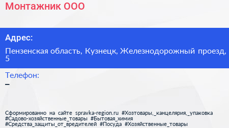 Монтажник, ООО по адресу Пензенская область, Кузнецк, Железнодорожный проезд, 5 в дальнейшем Организация, размещена в следующих категориях: