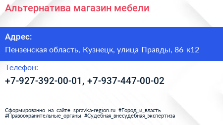 Альтернатива, магазин мебели по адресу Пензенская область, Кузнецк, улица Правды, 86 к12 в дальнейшем Организация, размещена в следующих категориях: