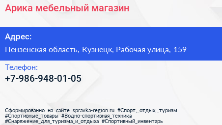 Арика, мебельный магазин по адресу Пензенская область, Кузнецк, Рабочая улица, 159 в дальнейшем Организация, размещена в следующих категориях: