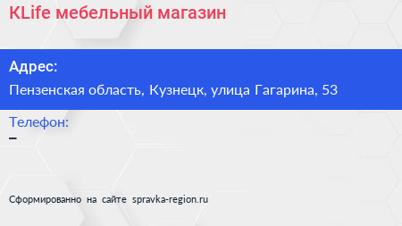 КLife, мебельный магазин по адресу Пензенская область, Кузнецк, улица Гагарина, 53 в дальнейшем Организация, размещена в следующих категориях: