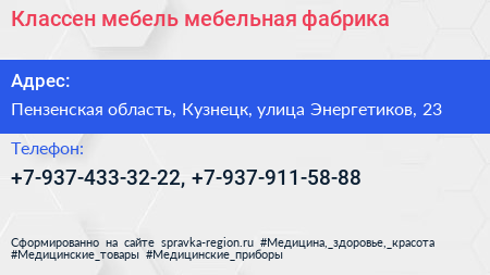 Классен мебель, мебельная фабрика по адресу Пензенская область, Кузнецк, улица Энергетиков, 23 в дальнейшем Организация, размещена в следующих категориях: