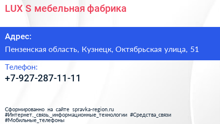 LUX-S, мебельная фабрика по адресу Пензенская область, Кузнецк, Октябрьская улица, 51 в дальнейшем Организация, размещена в следующих категориях: