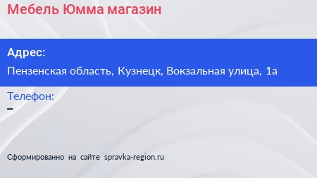 Мебель Юмма, магазин по адресу Пензенская область, Кузнецк, Вокзальная улица, 1а в дальнейшем Организация, размещена в следующих категориях:
